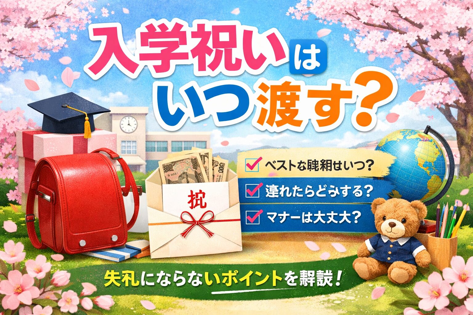 小学校は入学祝いの中でも特に大切にされやすく、入学式前がベストです。ランドセルや学用品に使えるため、現金で渡すと喜ばれやすいです。