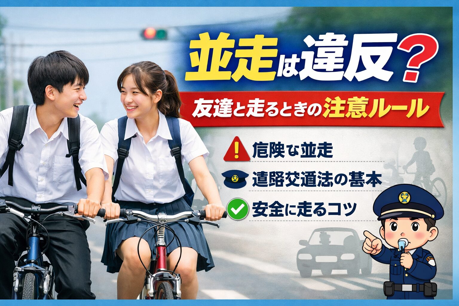 学校の周辺や駅前、交通量の多い道路では、警察が並走を特に注意深く見ています。友達と話しながら走っていると、声をかけられることも珍しくありません。注意だけで済むこともありますが、悪質だと判断されると指導や罰則の対象になることもあります。恥ずかしい思いをしないためにも、ルールは守りたいですね。
